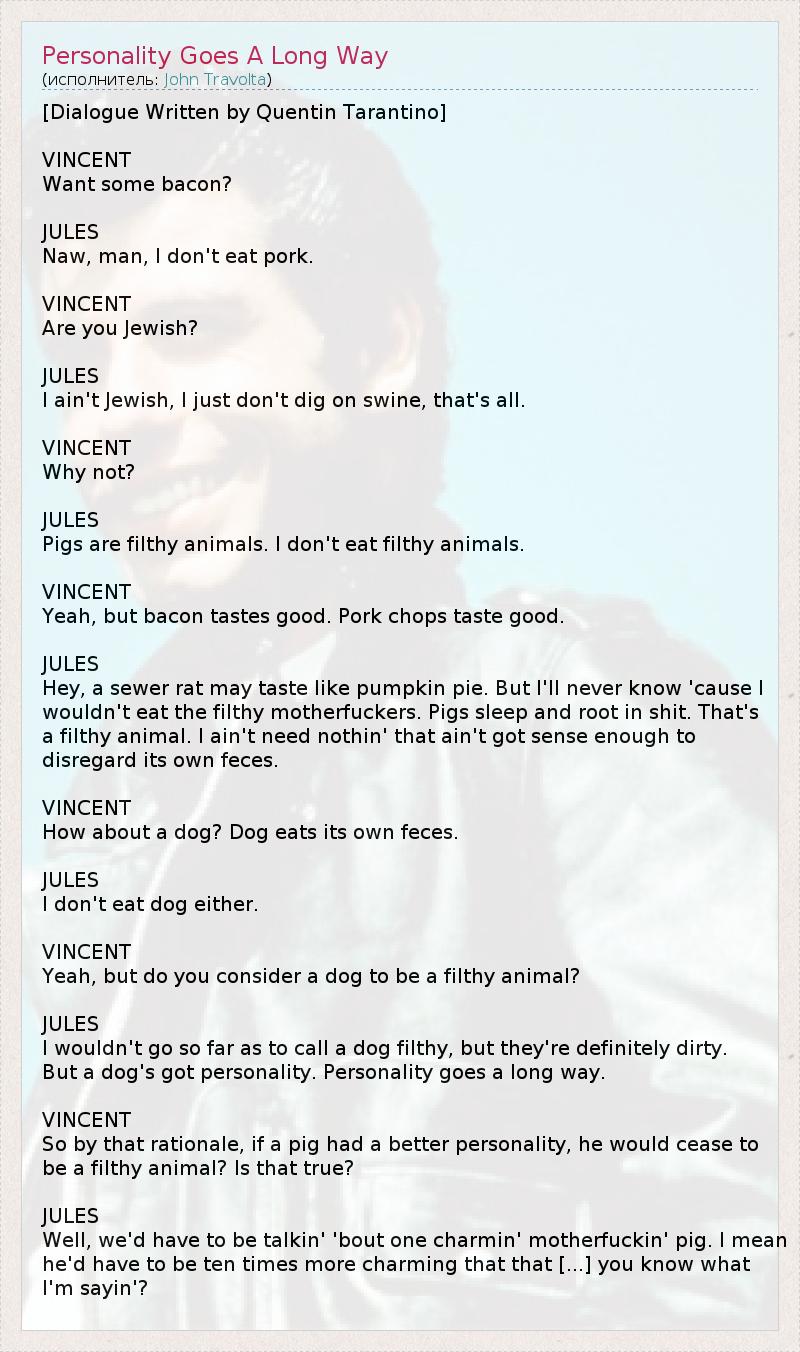 [Dialogue Written by Quentin Tarantino] VINCENT Want some bacon? JULES Naw, man, I don't eat pork. VINCENT Are you Jewish? JULES I ain't Jewish, I just don't dig on swine, that's all. VINCENT Why not? JULES Pigs are filthy animals. I don't eat filthy animals. VINCENT Yeah, but bacon tastes good. Pork chops taste good. JULES Hey, a sewer rat may taste like pumpkin pie. But I'll never know 'cause I wouldn't eat the filthy motherfuckers. Pigs sleep and root in shit. That's a filthy animal. I ain't need nothin' that ain't got sense enough to disregard its own feces. VINCENT How about a dog? Dog eats its own feces. JULES I don't eat dog either. VINCENT Yeah, but do you consider a dog to be a filthy animal? JULES I wouldn't go so far as to call a dog filthy, but they're definitely dirty. But a dog's got personality. Personality goes a long way. VINCENT So by that rationale, if a pig had a better personality, he would cease to be a filthy animal? Is that true? JULES Well, we'd have to be talkin' 'bout one charmin' motherfuckin' pig. I mean he'd have to be ten times more charming that that [...] you know what I'm sayin'?