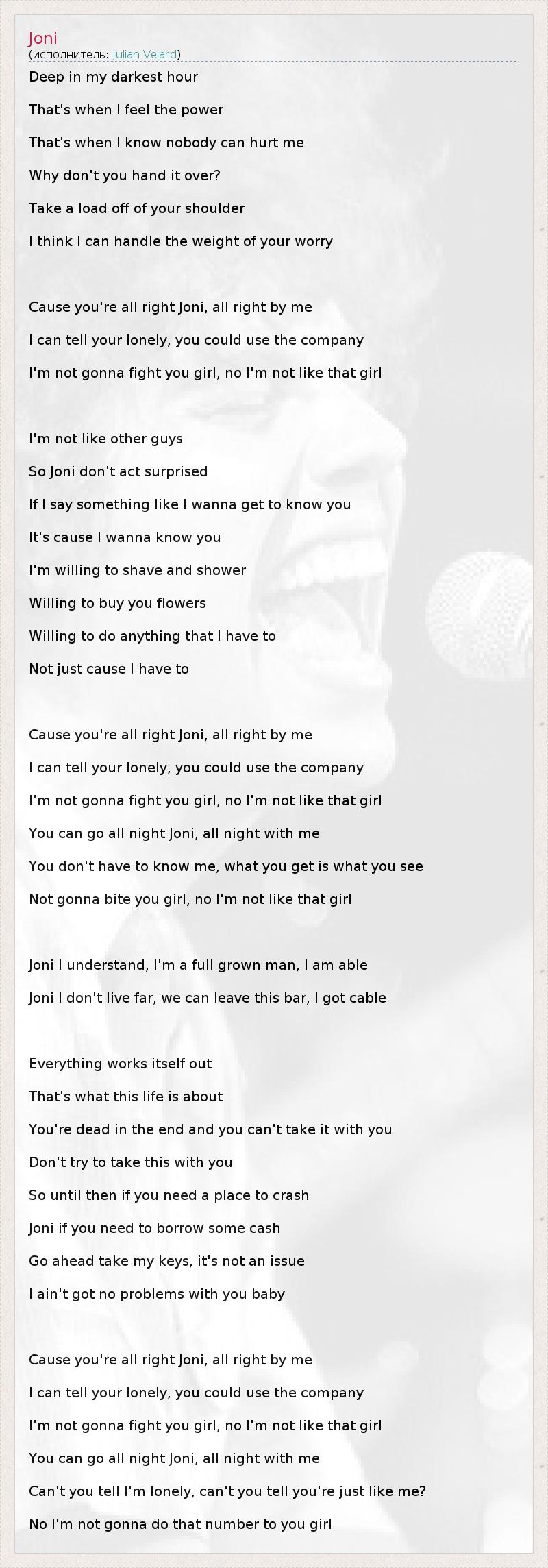 Deep in my darkest hour That's when I feel the power That's when I know nobody can hurt me Why don't you hand it over? Take a load off of your shoulder I think I can handle the weight of your worry Cause you're all right Joni, all right by me I can tell your lonely, you could use the company I'm not gonna fight you girl, no I'm not like that girl I'm not like other guys So Joni don't act surprised If I say something like I wanna get to know you It's cause I wanna know you I'm willing to shave and shower Willing to buy you flowers Willing to do anything that I have to Not just cause I have to Cause you're all right Joni, all right by me I can tell your lonely, you could use the company I'm not gonna fight you girl, no I'm not like that girl You can go all night Joni, all night with me You don't have to know me, what you get is what you see Not gonna bite you girl, no I'm not like that girl Joni I understand, I'm a full grown man, I am able Joni I don't live far, we can leave this bar, I got cable Everything works itself out That's what this life is about You're dead in the end and you can't take it with you Don't try to take this with you So until then if you need a place to crash Joni if you need to borrow some cash Go ahead take my keys, it's not an issue I ain't got no problems with you baby Cause you're all right Joni, all right by me I can tell your lonely, you could use the company I'm not gonna fight you girl, no I'm not like that girl You can go all night Joni, all night with me Can't you tell I'm lonely, can't you tell you're just like me? No I'm not gonna do that number to you girl