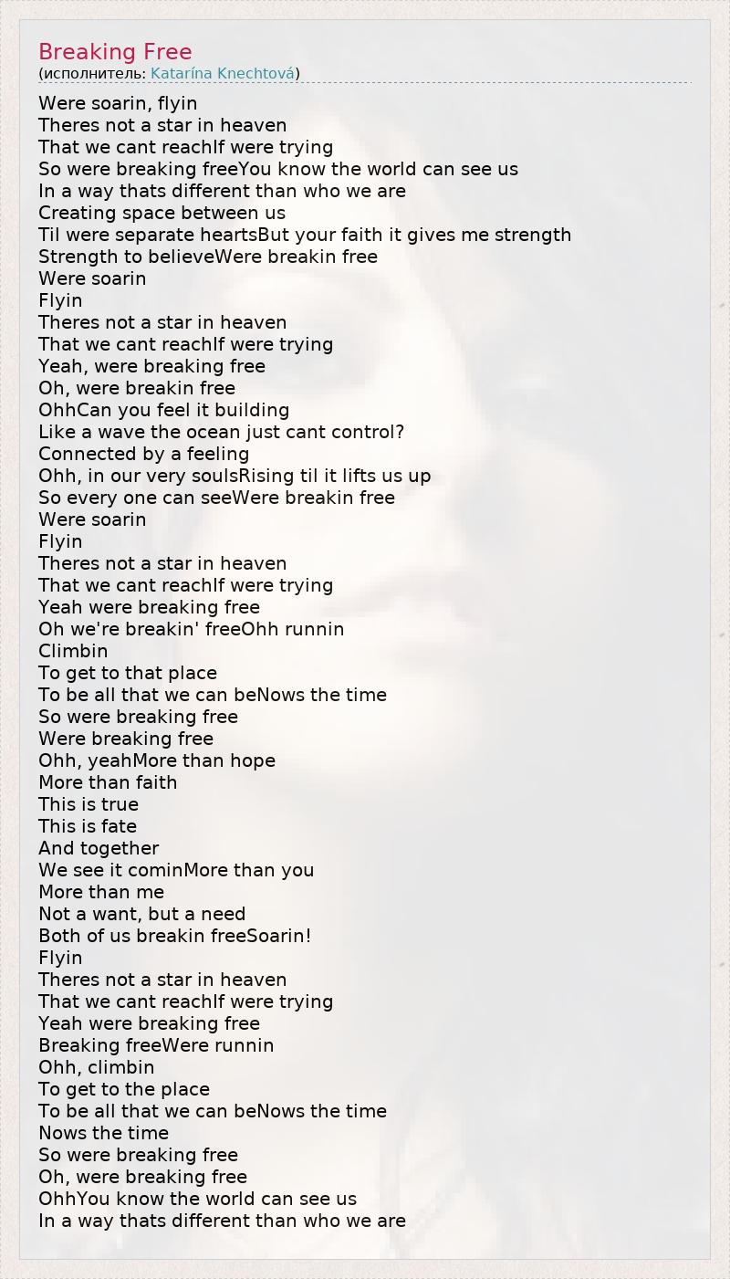 Were soarin, flyin Theres not a star in heaven That we cant reachIf were trying So were breaking freeYou know the world can see us In a way thats different than who we are Creating space between us Til were separate heartsBut your faith it gives me strength Strength to believeWere breakin free Were soarin Flyin Theres not a star in heaven That we cant reachIf were trying Yeah, were breaking free Oh, were breakin free OhhCan you feel it building Like a wave the ocean just cant control? Connected by a feeling Ohh, in our very soulsRising til it lifts us up So every one can seeWere breakin free Were soarin Flyin Theres not a star in heaven That we cant reachIf were trying Yeah were breaking free Oh we're breakin' freeOhh runnin Climbin To get to that place To be all that we can beNows the time So were breaking free Were breaking free Ohh, yeahMore than hope More than faith This is true This is fate And together We see it cominMore than you More than me Not a want, but a need Both of us breakin freeSoarin! Flyin Theres not a star in heaven That we cant reachIf were trying Yeah were breaking free Breaking freeWere runnin Ohh, climbin To get to the place To be all that we can beNows the time Nows the time So were breaking free Oh, were breaking free OhhYou know the world can see us In a way thats different than who we are