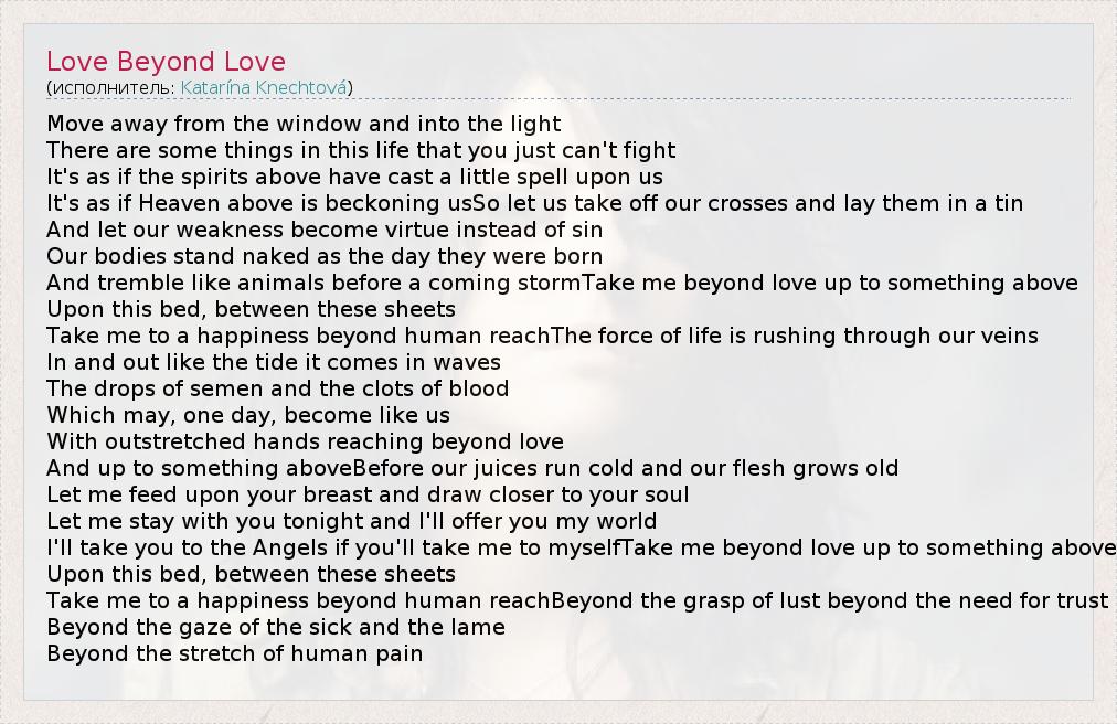 Move away from the window and into the light There are some things in this life that you just can't fight It's as if the spirits above have cast a little spell upon us It's as if Heaven above is beckoning usSo let us take off our crosses and lay them in a tin And let our weakness become virtue instead of sin Our bodies stand naked as the day they were born And tremble like animals before a coming stormTake me beyond love up to something above Upon this bed, between these sheets Take me to a happiness beyond human reachThe force of life is rushing through our veins In and out like the tide it comes in waves The drops of semen and the clots of blood Which may, one day, become like us With outstretched hands reaching beyond love And up to something aboveBefore our juices run cold and our flesh grows old Let me feed upon your breast and draw closer to your soul Let me stay with you tonight and I'll offer you my world I'll take you to the Angels if you'll take me to myselfTake me beyond love up to something above Upon this bed, between these sheets Take me to a happiness beyond human reachBeyond the grasp of lust beyond the need for trust Beyond the gaze of the sick and the lame Beyond the stretch of human pain