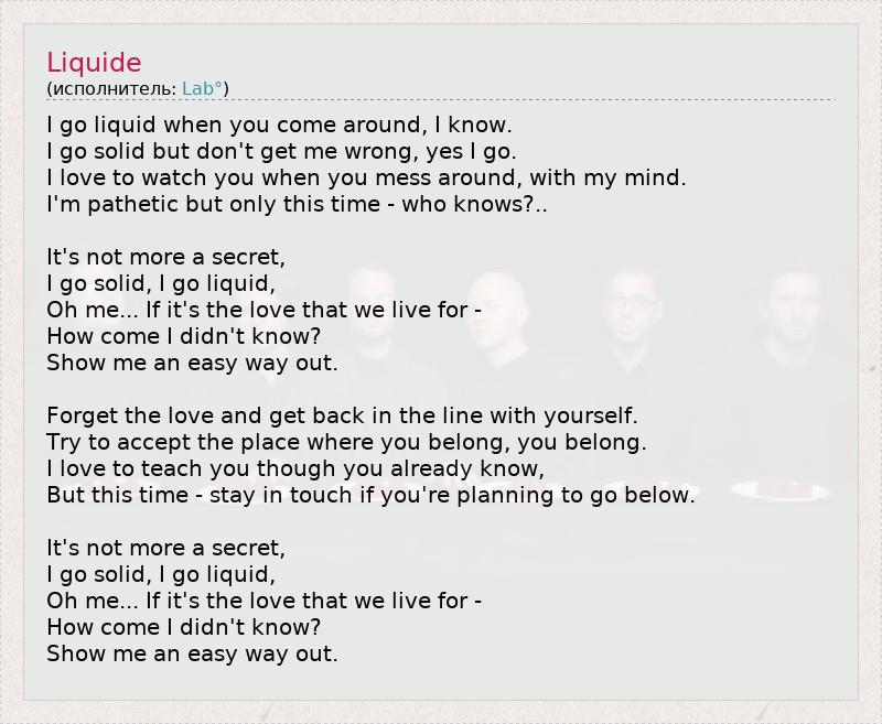 I go liquid when you come around, I know. I go solid but don't get me wrong, yes I go. I love to watch you when you mess around, with my mind. I'm pathetic but only this time - who knows?.. It's not more a secret, I go solid, I go liquid, Oh me... If it's the love that we live for - How come I didn't know? Show me an easy way out. Forget the love and get back in the line with yourself. Try to accept the place where you belong, you belong. I love to teach you though you already know, But this time - stay in touch if you're planning to go below. It's not more a secret, I go solid, I go liquid, Oh me... If it's the love that we live for - How come I didn't know? Show me an easy way out.