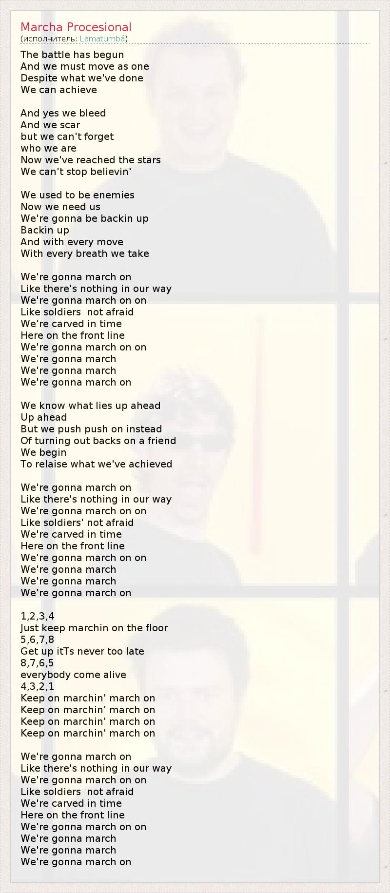 The battle has begun And we must move as one Despite what we've done We can achieve And yes we bleed And we scar but we can't forget who we are Now we've reached the stars We can't stop believin' We used to be enemies Now we need us We're gonna be backin up Backin up And with every move With every breath we take We're gonna march on Like there's nothing in our way We're gonna march on on Like soldiers not afraid We're carved in time Here on the front line We're gonna march on on We're gonna march We're gonna march We're gonna march on We know what lies up ahead Up ahead But we push push on instead Of turning out backs on a friend We begin To relaise what we've achieved We're gonna march on Like there's nothing in our way We're gonna march on on Like soldiers' not afraid We're carved in time Here on the front line We're gonna march on on We're gonna march We're gonna march We're gonna march on 1,2,3,4 Just keep marchin on the floor 5,6,7,8 Get up itТs never too late 8,7,6,5 everybody come alive 4,3,2,1 Keep on marchin' march on Keep on marchin' march on Keep on marchin' march on Keep on marchin' march on We're gonna march on Like there's nothing in our way We're gonna march on on Like soldiers not afraid We're carved in time Here on the front line We're gonna march on on We're gonna march We're gonna march We're gonna march on