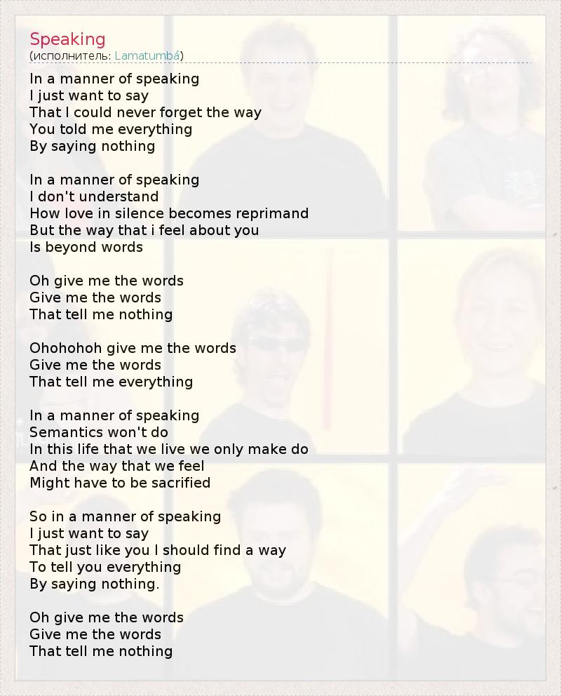 In a manner of speaking I just want to say That I could never forget the way You told me everything By saying nothing In a manner of speaking I don't understand How love in silence becomes reprimand But the way that i feel about you Is beyond words Oh give me the words Give me the words That tell me nothing Ohohohoh give me the words Give me the words That tell me everything In a manner of speaking Semantics won't do In this life that we live we only make do And the way that we feel Might have to be sacrified So in a manner of speaking I just want to say That just like you I should find a way To tell you everything By saying nothing. Oh give me the words Give me the words That tell me nothing