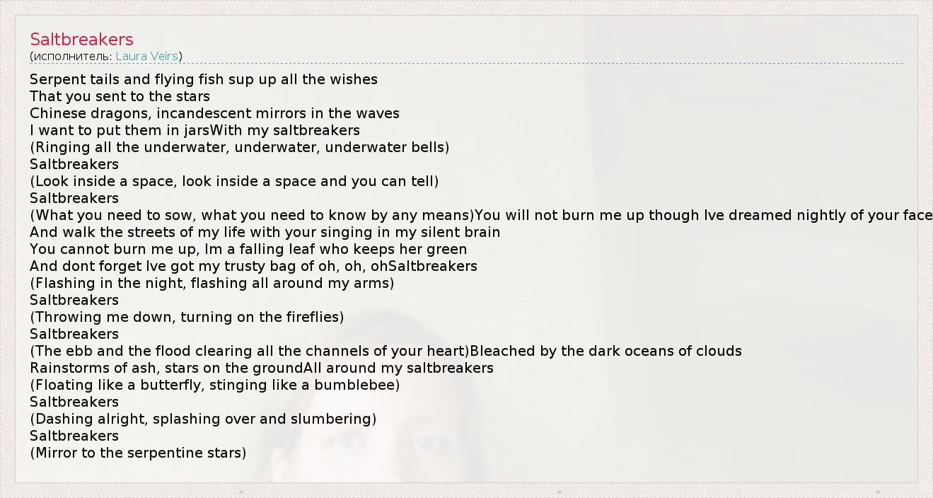 Serpent tails and flying fish sup up all the wishes That you sent to the stars Chinese dragons, incandescent mirrors in the waves I want to put them in jarsWith my saltbreakers (Ringing all the underwater, underwater, underwater bells) Saltbreakers (Look inside a space, look inside a space and you can tell) Saltbreakers (What you need to sow, what you need to know by any means)You will not burn me up though Ive dreamed nightly of your face And walk the streets of my life with your singing in my silent brain You cannot burn me up, Im a falling leaf who keeps her green And dont forget Ive got my trusty bag of oh, oh, ohSaltbreakers (Flashing in the night, flashing all around my arms) Saltbreakers (Throwing me down, turning on the fireflies) Saltbreakers (The ebb and the flood clearing all the channels of your heart)Bleached by the dark oceans of clouds Rainstorms of ash, stars on the groundAll around my saltbreakers (Floating like a butterfly, stinging like a bumblebee) Saltbreakers (Dashing alright, splashing over and slumbering) Saltbreakers (Mirror to the serpentine stars)