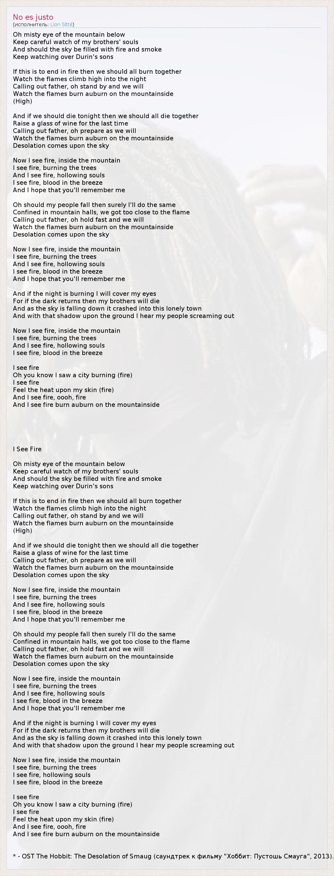 Oh misty eye of the mountain below Keep careful watch of my brothers' souls And should the sky be filled with fire and smoke Keep watching over Durin's sons If this is to end in fire then we should all burn together Watch the flames climb high into the night Calling out father, oh stand by and we will Watch the flames burn auburn on the mountainside (High) And if we should die tonight then we should all die together Raise a glass of wine for the last time Calling out father, oh prepare as we will Watch the flames burn auburn on the mountainside Desolation comes upon the sky Now I see fire, inside the mountain I see fire, burning the trees And I see fire, hollowing souls I see fire, blood in the breeze And I hope that you'll remember me Oh should my people fall then surely I'll do the same Confined in mountain halls, we got too close to the flame Calling out father, oh hold fast and we will Watch the flames burn auburn on the mountainside Desolation comes upon the sky Now I see fire, inside the mountain I see fire, burning the trees And I see fire, hollowing souls I see fire, blood in the breeze And I hope that you'll remember me And if the night is burning I will cover my eyes For if the dark returns then my brothers will die And as the sky is falling down it crashed into this lonely town And with that shadow upon the ground I hear my people screaming out Now I see fire, inside the mountain I see fire, burning the trees And I see fire, hollowing souls I see fire, blood in the breeze I see fire Oh you know I saw a city burning (fire) I see fire Feel the heat upon my skin (fire) And I see fire, oooh, fire And I see fire burn auburn on the mountainside I See Fire Oh misty eye of the mountain below Keep careful watch of my brothers' souls And should the sky be filled with fire and smoke Keep watching over Durin's sons If this is to end in fire then we should all burn together Watch the flames climb high into the night Calling out father, oh stand by and we will Watch the flames burn auburn on the mountainside (High) And if we should die tonight then we should all die together Raise a glass of wine for the last time Calling out father, oh prepare as we will Watch the flames burn auburn on the mountainside Desolation comes upon the sky Now I see fire, inside the mountain I see fire, burning the trees And I see fire, hollowing souls I see fire, blood in the breeze And I hope that you'll remember me Oh should my people fall then surely I'll do the same Confined in mountain halls, we got too close to the flame Calling out father, oh hold fast and we will Watch the flames burn auburn on the mountainside Desolation comes upon the sky Now I see fire, inside the mountain I see fire, burning the trees And I see fire, hollowing souls I see fire, blood in the breeze And I hope that you'll remember me And if the night is burning I will cover my eyes For if the dark returns then my brothers will die And as the sky is falling down it crashed into this lonely town And with that shadow upon the ground I hear my people screaming out Now I see fire, inside the mountain I see fire, burning the trees I see fire, hollowing souls I see fire, blood in the breeze I see fire Oh you know I saw a city burning (fire) I see fire Feel the heat upon my skin (fire) And I see fire, oooh, fire And I see fire burn auburn on the mountainside * - OST The Hobbit: The Desolation of Smaug (саундтрек к фильму "Хоббит: Пустошь Смауга", 2013).