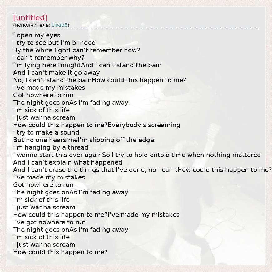 I open my eyes I try to see but I'm blinded By the white lightI can't remember how? I can't remember why? I'm lying here tonightAnd I can't stand the pain And I can't make it go away No, I can't stand the painHow could this happen to me? I've made my mistakes Got nowhere to run The night goes onAs I'm fading away I'm sick of this life I just wanna scream How could this happen to me?Everybody's screaming I try to make a sound But no one hears meI'm slipping off the edge I'm hanging by a thread I wanna start this over againSo I try to hold onto a time when nothing mattered And I can't explain what happened And I can't erase the things that I've done, no I can'tHow could this happen to me? I've made my mistakes Got nowhere to run The night goes onAs I'm fading away I'm sick of this life I just wanna scream How could this happen to me?I've made my mistakes I've got nowhere to run The night goes onAs I'm fading away I'm sick of this life I just wanna scream How could this happen to me?