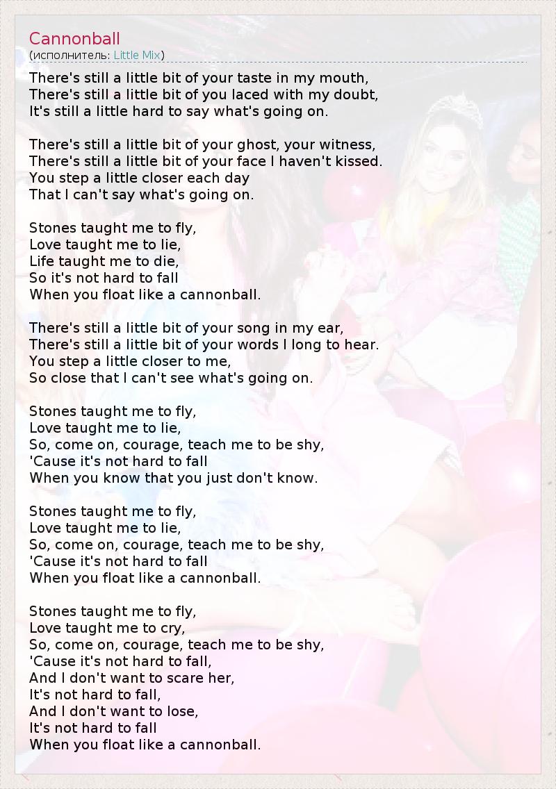 There's still a little bit of your taste in my mouth, There's still a little bit of you laced with my doubt, It's still a little hard to say what's going on. There's still a little bit of your ghost, your witness, There's still a little bit of your face I haven't kissed. You step a little closer each day That I can't say what's going on. Stones taught me to fly, Love taught me to lie, Life taught me to die, So it's not hard to fall When you float like a cannonball. There's still a little bit of your song in my ear, There's still a little bit of your words I long to hear. You step a little closer to me, So close that I can't see what's going on. Stones taught me to fly, Love taught me to lie, So, come on, courage, teach me to be shy, 'Cause it's not hard to fall When you know that you just don't know. Stones taught me to fly, Love taught me to lie, So, come on, courage, teach me to be shy, 'Cause it's not hard to fall When you float like a cannonball. Stones taught me to fly, Love taught me to cry, So, come on, courage, teach me to be shy, 'Cause it's not hard to fall, And I don't want to scare her, It's not hard to fall, And I don't want to lose, It's not hard to fall When you float like a cannonball.