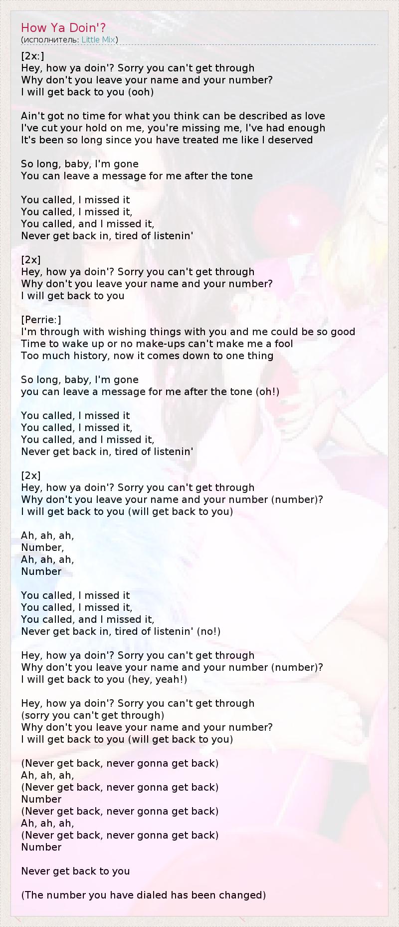[2x:] Hey, how ya doin'? Sorry you can't get through Why don't you leave your name and your number? I will get back to you (ooh) Ain't got no time for what you think can be described as love I've cut your hold on me, you're missing me, I've had enough It's been so long since you have treated me like I deserved So long, baby, I'm gone You can leave a message for me after the tone You called, I missed it You called, I missed it, You called, and I missed it, Never get back in, tired of listenin' [2x] Hey, how ya doin'? Sorry you can't get through Why don't you leave your name and your number? I will get back to you [Perrie:] I'm through with wishing things with you and me could be so good Time to wake up or no make-ups can't make me a fool Too much history, now it comes down to one thing So long, baby, I'm gone you can leave a message for me after the tone (oh!) You called, I missed it You called, I missed it, You called, and I missed it, Never get back in, tired of listenin' [2x] Hey, how ya doin'? Sorry you can't get through Why don't you leave your name and your number (number)? I will get back to you (will get back to you) Ah, ah, ah, Number, Ah, ah, ah, Number You called, I missed it You called, I missed it, You called, and I missed it, Never get back in, tired of listenin' (no!) Hey, how ya doin'? Sorry you can't get through Why don't you leave your name and your number (number)? I will get back to you (hey, yeah!) Hey, how ya doin'? Sorry you can't get through (sorry you can't get through) Why don't you leave your name and your number? I will get back to you (will get back to you) (Never get back, never gonna get back) Ah, ah, ah, (Never get back, never gonna get back) Number (Never get back, never gonna get back) Ah, ah, ah, (Never get back, never gonna get back) Number Never get back to you (The number you have dialed has been changed)