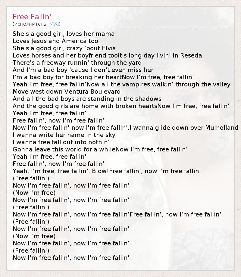 She's a good girl, loves her mama Loves Jesus and America too She's a good girl, crazy 'bout Elvis Loves horses and her boyfriend tooIt's long day livin' in Reseda There's a freeway runnin' through the yard And I'm a bad boy 'cause I don't even miss her I'm a bad boy for breaking her heartNow I'm free, free fallin' Yeah I'm free, free fallin'Now all the vampires walkin' through the valley Move west down Ventura Boulevard And all the bad boys are standing in the shadows And the good girls are home with broken heartsNow I'm free, free fallin' Yeah I'm free, free fallin' Free fallin', now I'm free fallin' Now I'm free fallin' now I'm free fallin'.I wanna glide down over Mulholland I wanna write her name in the sky I wanna free fall out into nothin' Gonna leave this world for a whileNow I'm free, free fallin' Yeah I'm free, free fallin' Free fallin', now I'm free fallin' Yeah, I'm free, free fallin'. Blow!Free fallin', now I'm free fallin' (Free fallin') Now I'm free fallin', now I'm free fallin' (Now I'm free) Now I'm free fallin', now I'm free fallin' (Free fallin') Now I'm free fallin', now I'm free fallin'Free fallin', now I'm free fallin' (Free fallin') Now I'm free fallin', now I'm free fallin' (Now I'm free) Now I'm free fallin', now I'm free fallin' (Free fallin') Now I'm free fallin', now I'm free fallin'