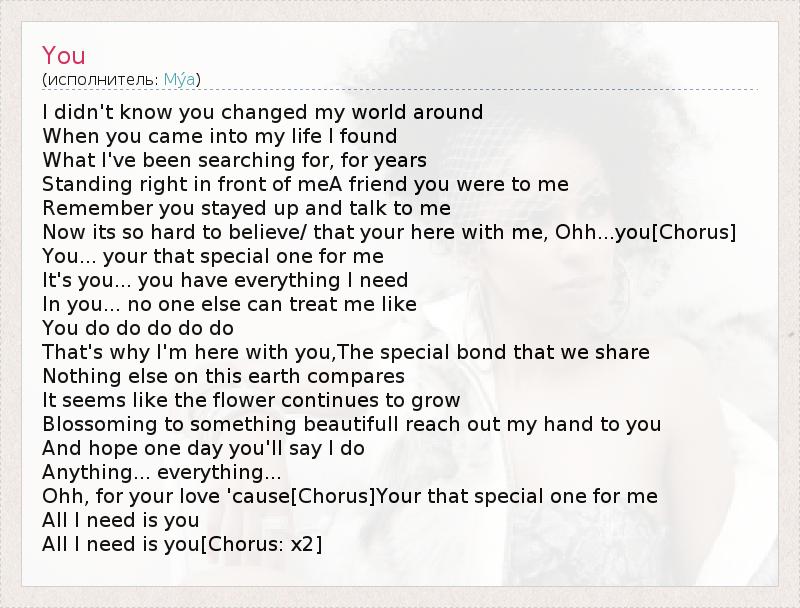 I didn't know you changed my world around When you came into my life I found What I've been searching for, for years Standing right in front of meA friend you were to me Remember you stayed up and talk to me Now its so hard to believe/ that your here with me, Ohh...you[Chorus] You... your that special one for me It's you... you have everything I need In you... no one else can treat me like You do do do do do That's why I'm here with you,The special bond that we share Nothing else on this earth compares It seems like the flower continues to grow Blossoming to something beautifulI reach out my hand to you And hope one day you'll say I do Anything... everything... Ohh, for your love 'cause[Chorus]Your that special one for me All I need is you All I need is you[Chorus: x2]