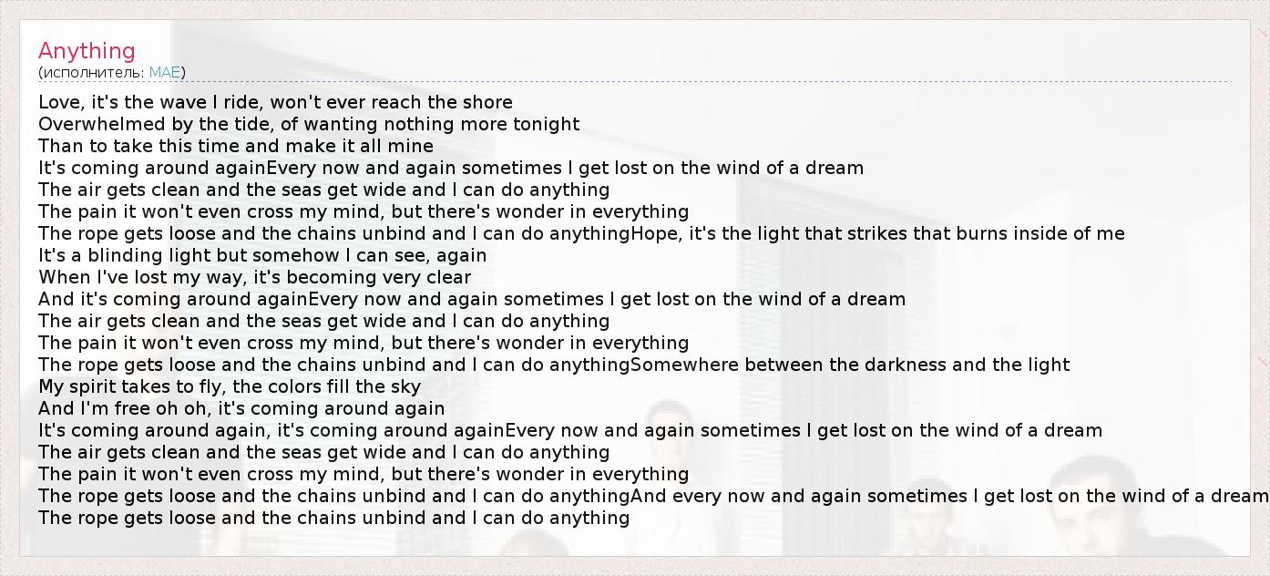 And it's coming around againEvery now and again sometimes I get lost on the wind of a dream
