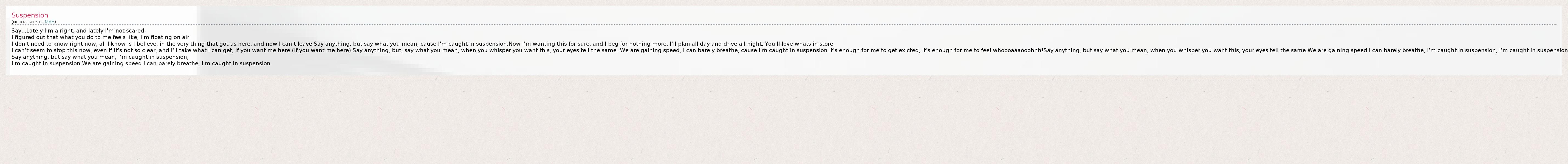 I can't seem to stop this now, even if it's not so clear, and I'll take what I can get, if you want me here (if you want me here).Say anything, but, say what you mean, when you whisper you want this, your eyes tell the same. We are gaining speed, I can barely breathe, cause I'm caught in suspension.It's enough for me to get exicted, It's enough for me to feel whoooaaaooohhh!Say anything, but say what you mean, when you whisper you want this, your eyes tell the same.We are gaining speed I can barely breathe, I'm caught in suspension, I'm caught in suspension