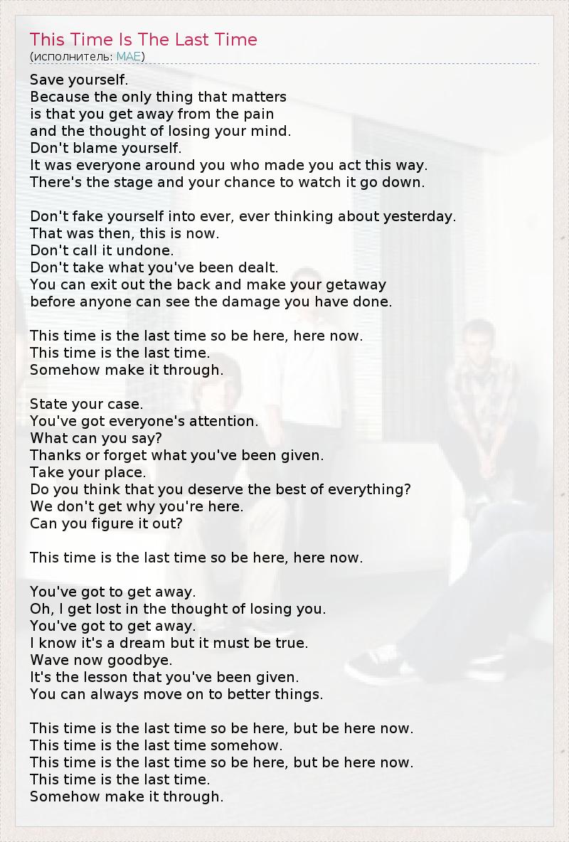 Save yourself. Because the only thing that matters is that you get away from the pain and the thought of losing your mind. Don't blame yourself. It was everyone around you who made you act this way. There's the stage and your chance to watch it go down. Don't fake yourself into ever, ever thinking about yesterday. That was then, this is now. Don't call it undone. Don't take what you've been dealt. You can exit out the back and make your getaway before anyone can see the damage you have done. This time is the last time so be here, here now. This time is the last time. Somehow make it through. State your case. You've got everyone's attention. What can you say? Thanks or forget what you've been given. Take your place. Do you think that you deserve the best of everything? We don't get why you're here. Can you figure it out? This time is the last time so be here, here now. You've got to get away. Oh, I get lost in the thought of losing you. You've got to get away. I know it's a dream but it must be true. Wave now goodbye. It's the lesson that you've been given. You can always move on to better things. This time is the last time so be here, but be here now. This time is the last time somehow. This time is the last time so be here, but be here now. This time is the last time. Somehow make it through.