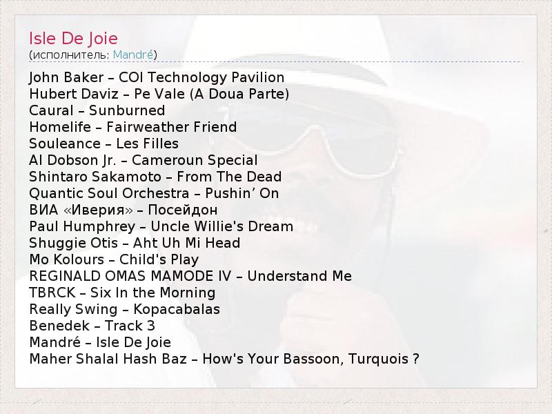 Джон Бейкер - ИСП технологии павильон Юбер Daviz - Пе Вале (Doua Парте ) Caural - Sunburned Homelife - Фэрвитэр другу Souleance - Лес Filles Аль Добсон младший - Камерун Специальный Синтаро Сакамото - ОтМертвого Quantic Soul Orchestra - Пущин " На ВИА « Иверия » - Посейдон Пол Хамфри - Дядя Вилли Мечта Shuggie Отис - Aht Э Ми Руководитель Мо Kolours - Детские игрушки Реджинальд OMAS MAMODE IV - Поймите меня TBRCK - в шесть утра Действительно свинг - Kopacabalas Бенедек - Дорожка 3 Мандре - Остров Де Радость Махер шелал Хэш Баз - Как Ваш Фагот , Turquois ?
