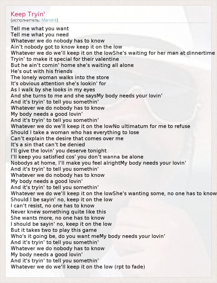 Tell me what you want Tell me what you need Whatever we do nobody has to know Ain't nobody got to know keep it on the low Whatever we do we'll keep it on the lowShe's waiting for her man at dinnertime Tryin' to make it special for their valentine But he ain't comin' home she's waiting all alone He's out with his friends The lonely woman walks into the store It's obvious attention she's lookin' for As I walk by she looks in my eyes And she turns to me and she saysMy body needs your lovin' And it's tryin' to tell you somethin' Whatever we do nobody has to know My body needs a good lovin' And it's tryin' to tell you somethin' Whatever we do we'll keep it on the lowNo ultimatum for me to refuse Should I take a woman who has everything to lose Can't explain the desire that comes over me It's a sin that can't be denied I'll give the lovin' you deserve tonight I'll keep you satisfied cos' you don't wanna be alone Nobodys at home, I'll make you feel alrightMy body needs your lovin' And it's tryin' to tell you somethin' Whatever we do nobody has to know My body needs a good lovin' And it's tryin' to tell you somethin' Whatever we do we'll keep it on the lowShe's wanting some, no one has to know Should I be sayin' no, keep it on the low I can't resist, no one has to know Never knew something quite like this She wants more, no one has to know I should be sayin' no, keep it on the low But it takes two to play this game Who's it going be, do you want meMy body needs your lovin' And it's tryin' to tell you somethin' Whatever we do nobody has to know My body needs a good lovin' And it's tryin' to tell you somethin' Whatever we do we'll keep it on the low (rpt to fade)