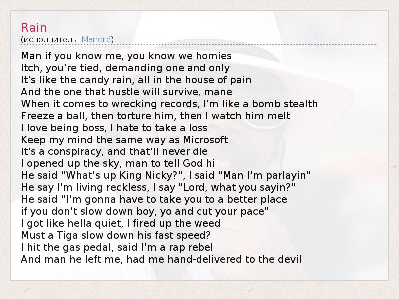Man if you know me, you know we homies Itch, you're tied, demanding one and only It's like the candy rain, all in the house of pain And the one that hustle will survive, mane When it comes to wrecking records, I'm like a bomb stealth Freeze a ball, then torture him, then I watch him melt I love being boss, I hate to take a loss Keep my mind the same way as Microsoft It's a conspiracy, and that'll never die I opened up the sky, man to tell God hi He said "What's up King Nicky?", I said "Man I'm parlayin" He say I'm living reckless, I say "Lord, what you sayin?" He said "I'm gonna have to take you to a better place if you don't slow down boy, yo and cut your pace" I got like hella quiet, I fired up the weed Must a Tiga slow down his fast speed? I hit the gas pedal, said I'm a rap rebel And man he left me, had me hand-delivered to the devil