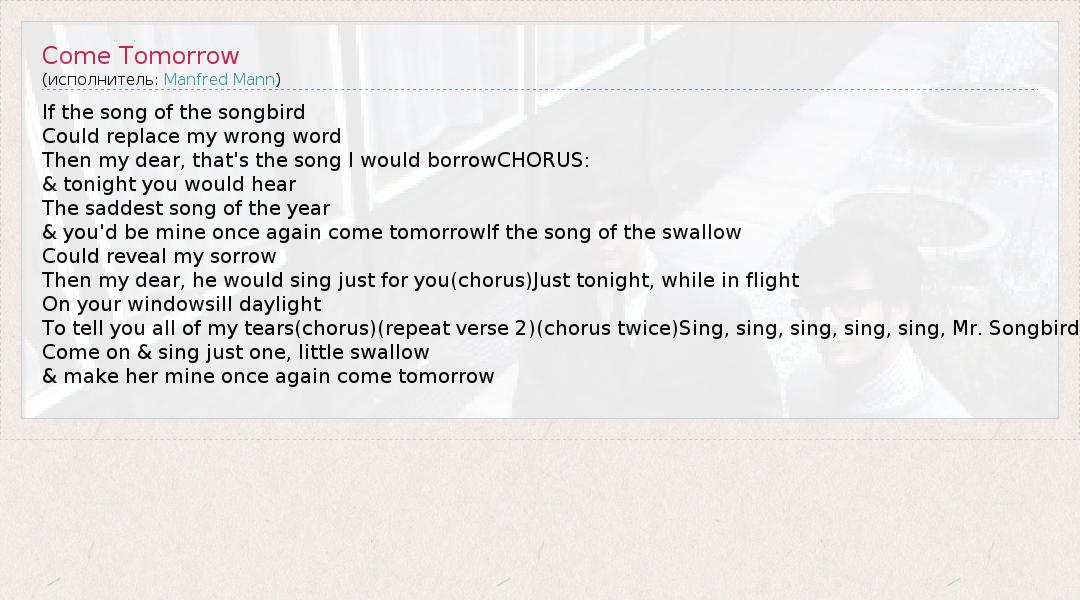 А как ты думаешь, о чем песня "Come Tomorrow" ?