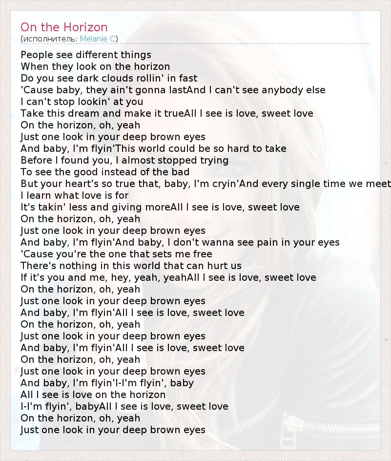 People see different things When they look on the horizon Do you see dark clouds rollin' in fast 'Cause baby, they ain't gonna lastAnd I can't see anybody else I can't stop lookin' at you Take this dream and make it trueAll I see is love, sweet love On the horizon, oh, yeah Just one look in your deep brown eyes And baby, I'm flyin'This world could be so hard to take Before I found you, I almost stopped trying To see the good instead of the bad But your heart's so true that, baby, I'm cryin'And every single time we meet I learn what love is for It's takin' less and giving moreAll I see is love, sweet love On the horizon, oh, yeah Just one look in your deep brown eyes And baby, I'm flyin'And baby, I don't wanna see pain in your eyes 'Cause you're the one that sets me free There's nothing in this world that can hurt us If it's you and me, hey, yeah, yeahAll I see is love, sweet love On the horizon, oh, yeah Just one look in your deep brown eyes And baby, I'm flyin'All I see is love, sweet love On the horizon, oh, yeah Just one look in your deep brown eyes And baby, I'm flyin'All I see is love, sweet love On the horizon, oh, yeah Just one look in your deep brown eyes And baby, I'm flyin'I-I'm flyin', baby All I see is love on the horizon I-I'm flyin', babyAll I see is love, sweet love On the horizon, oh, yeah Just one look in your deep brown eyes
