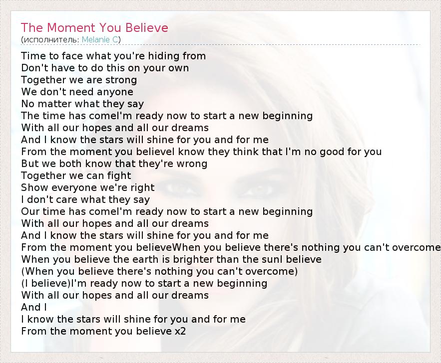 Time to face what you're hiding from Don't have to do this on your own Together we are strong We don't need anyone No matter what they say The time has comeI'm ready now to start a new beginning With all our hopes and all our dreams And I know the stars will shine for you and for me From the moment you believeI know they think that I'm no good for you But we both know that they're wrong Together we can fight Show everyone we're right I don't care what they say Our time has comeI'm ready now to start a new beginning With all our hopes and all our dreams And I know the stars will shine for you and for me From the moment you believeWhen you believe there's nothing you can't overcome When you believe the earth is brighter than the sunI believe (When you believe there's nothing you can't overcome) (I believe)I'm ready now to start a new beginning With all our hopes and all our dreams And I I know the stars will shine for you and for me From the moment you believe x2