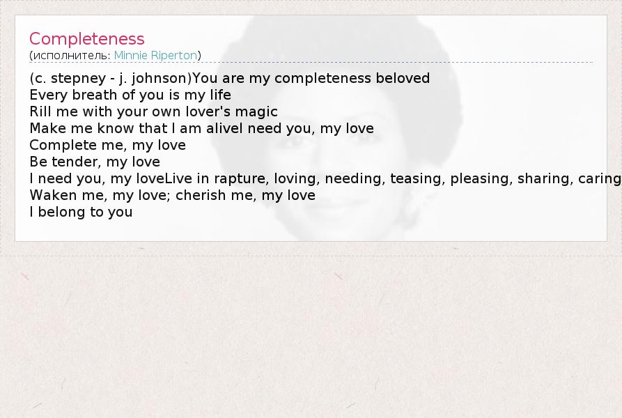 (c. stepney - j. johnson)You are my completeness beloved Every breath of you is my life Rill me with your own lover's magic Make me know that I am aliveI need you, my love Complete me, my love Be tender, my love I need you, my loveLive in rapture, loving, needing, teasing, pleasing, sharing, caring Waken me, my love; cherish me, my love I belong to you