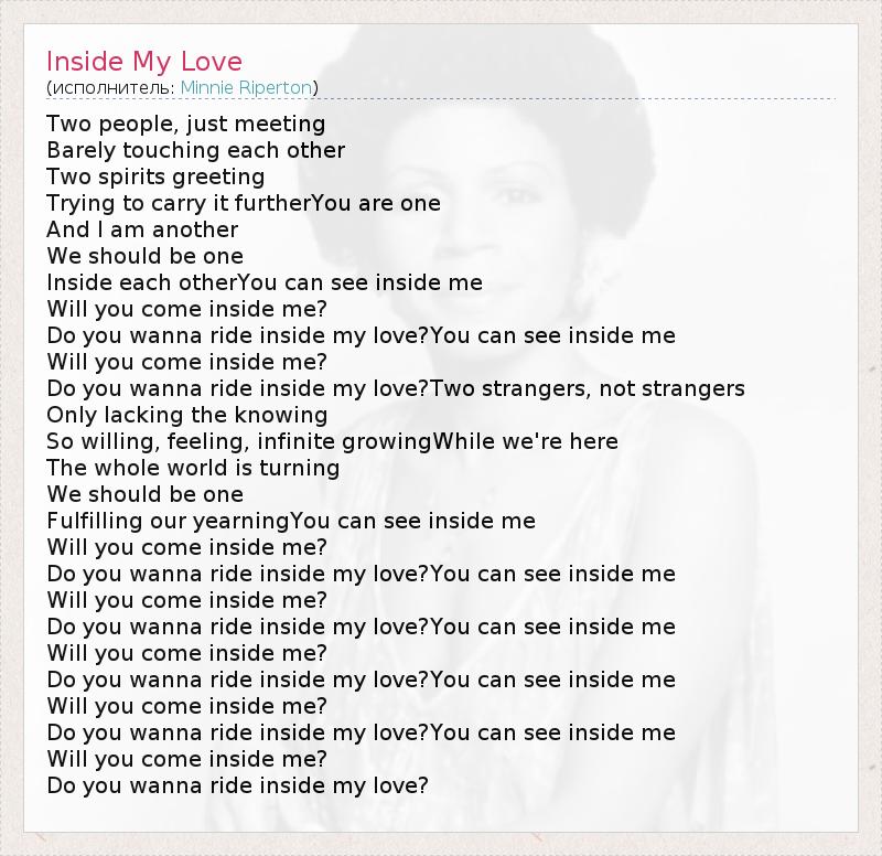 Two people, just meeting Barely touching each other Two spirits greeting Trying to carry it furtherYou are one And I am another We should be one Inside each otherYou can see inside me Will you come inside me? Do you wanna ride inside my love?You can see inside me Will you come inside me? Do you wanna ride inside my love?Two strangers, not strangers Only lacking the knowing So willing, feeling, infinite growingWhile we're here The whole world is turning We should be one Fulfilling our yearningYou can see inside me Will you come inside me? Do you wanna ride inside my love?You can see inside me Will you come inside me? Do you wanna ride inside my love?You can see inside me Will you come inside me? Do you wanna ride inside my love?You can see inside me Will you come inside me? Do you wanna ride inside my love?You can see inside me Will you come inside me? Do you wanna ride inside my love?