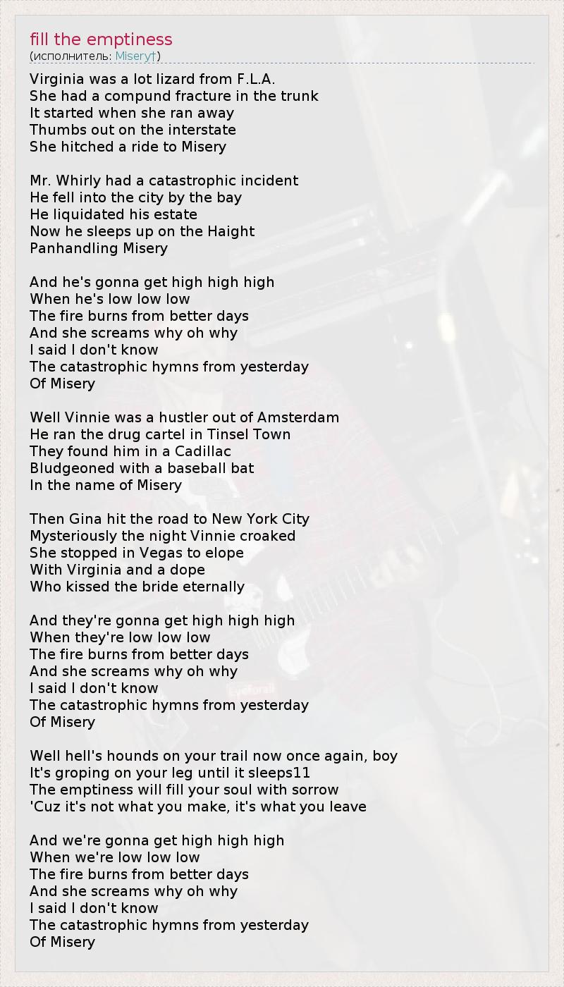 Virginia was a lot lizard from F.L.A. She had a compund fracture in the trunk It started when she ran away Thumbs out on the interstate She hitched a ride to Misery Mr. Whirly had a catastrophic incident He fell into the city by the bay He liquidated his estate Now he sleeps up on the Haight Panhandling Misery And he's gonna get high high high When he's low low low The fire burns from better days And she screams why oh why I said I don't know The catastrophic hymns from yesterday Of Misery Well Vinnie was a hustler out of Amsterdam He ran the drug cartel in Tinsel Town They found him in a Cadillac Bludgeoned with a baseball bat In the name of Misery Then Gina hit the road to New York City Mysteriously the night Vinnie croaked She stopped in Vegas to elope With Virginia and a dope Who kissed the bride eternally And they're gonna get high high high When they're low low low The fire burns from better days And she screams why oh why I said I don't know The catastrophic hymns from yesterday Of Misery Well hell's hounds on your trail now once again, boy It's groping on your leg until it sleeps11 The emptiness will fill your soul with sorrow 'Cuz it's not what you make, it's what you leave And we're gonna get high high high When we're low low low The fire burns from better days And she screams why oh why I said I don't know The catastrophic hymns from yesterday Of Misery