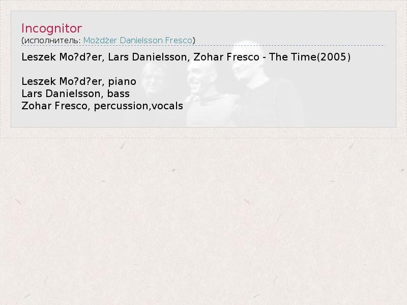Leszek Mo?d?er, Lars Danielsson, Zohar Fresco - The Time(2005) Leszek Mo?d?er, piano Lars Danielsson, bass Zohar Fresco, percussion,vocals