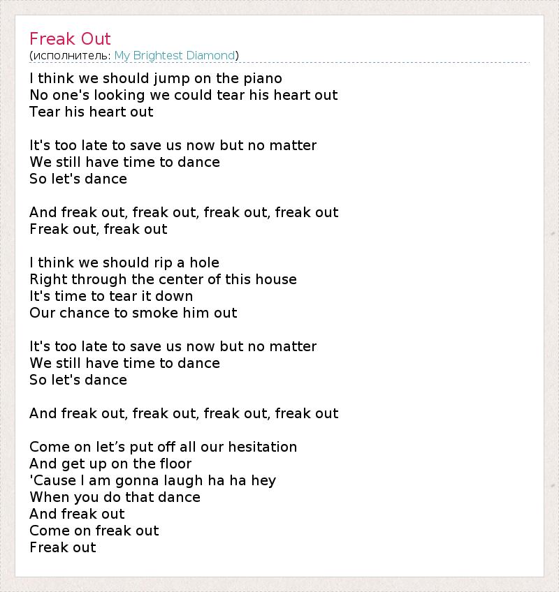 I think we should jump on the piano No one's looking we could tear his heart out Tear his heart out It's too late to save us now but no matter We still have time to dance So let's dance And freak out, freak out, freak out, freak out Freak out, freak out I think we should rip a hole Right through the center of this house It's time to tear it down Our chance to smoke him out It's too late to save us now but no matter We still have time to dance So let's dance And freak out, freak out, freak out, freak out Come on let’s put off all our hesitation And get up on the floor 'Cause I am gonna laugh ha ha hey When you do that dance And freak out Come on freak out Freak out