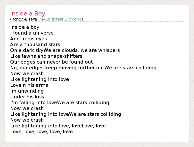 Inside a boy I found a universe And in his eyes Are a thousand stars On a dark skyWe are clouds, we are whispers Like fawns and shape-shifters Our edges can never be found out No, our edges keep moving further outWe are stars colliding Now we crash Like lightening into love LoveIn his arms Im unwinding Under his kiss I'm falling into loveWe are stars colliding Now we crash Like lightening into loveWe are stars colliding Now we crash Like lightening into love, loveLove, love Love, love, love, love, love