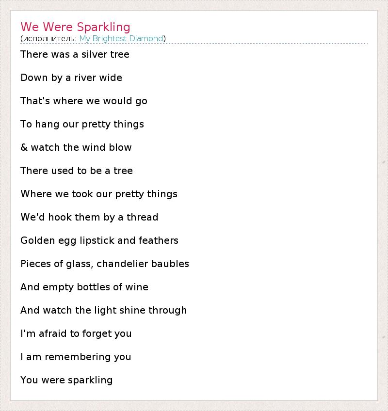 There was a silver tree Down by a river wide That's where we would go To hang our pretty things & watch the wind blow There used to be a tree Where we took our pretty things We'd hook them by a thread Golden egg lipstick and feathers Pieces of glass, chandelier baubles And empty bottles of wine And watch the light shine through I'm afraid to forget you I am remembering you You were sparkling