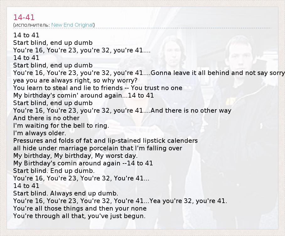 14 to 41 Start blind, end up dumb You're 16, You're 23, you're 32, you're 41.... 14 to 41 Start blind, end up dumb You're 16, You're 23, you're 32, you're 41....Gonna leave it all behind and not say sorry yea you are always right, so why worry? You learn to steal and lie to friends -- You trust no one My birthday's comin' around again...14 to 41 Start blind, end up dumb You're 16, You're 23, you're 32, you're 41....And there is no other way And there is no other I'm waiting for the bell to ring. I'm always older. Pressures and folds of fat and lip-stained lipstick calenders all hide under marriage porcelain that I'm falling over My birthday, My birthday, My worst day. My Birthday's comin around again --14 to 41 Start blind. End up dumb. You're 16, You're 23, You're 32, You're 41... 14 to 41 Start blind. Always end up dumb. You're 16, You're 23, You're 32, You're 41...Yea you're 32, you're 41. You're all those things and then your none You're through all that, you've just begun.