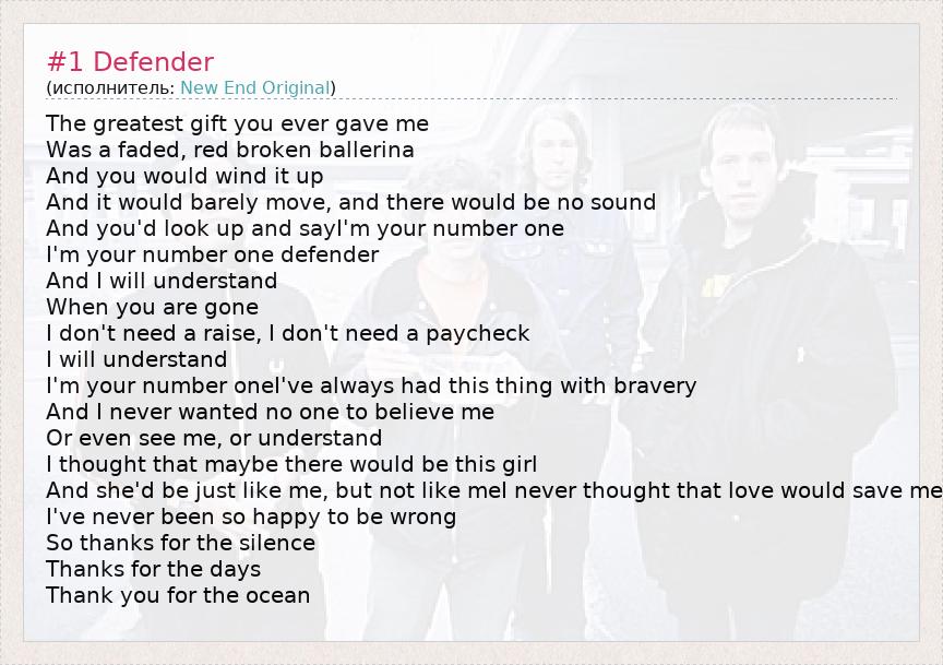 The greatest gift you ever gave me Was a faded, red broken ballerina And you would wind it up And it would barely move, and there would be no sound And you'd look up and sayI'm your number one I'm your number one defender And I will understand When you are gone I don't need a raise, I don't need a paycheck I will understand I'm your number oneI've always had this thing with bravery And I never wanted no one to believe me Or even see me, or understand I thought that maybe there would be this girl And she'd be just like me, but not like meI never thought that love would save me I've never been so happy to be wrong So thanks for the silence Thanks for the days Thank you for the ocean