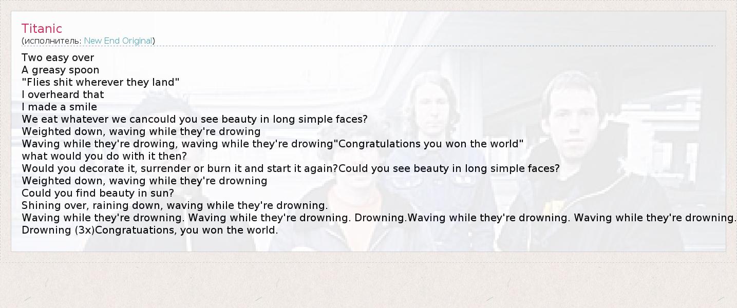 Two easy over A greasy spoon "Flies shit wherever they land" I overheard that I made a smile We eat whatever we cancould you see beauty in long simple faces? Weighted down, waving while they're drowing Waving while they're drowing, waving while they're drowing"Congratulations you won the world" what would you do with it then? Would you decorate it, surrender or burn it and start it again?Could you see beauty in long simple faces? Weighted down, waving while they're drowning Could you find beauty in sun? Shining over, raining down, waving while they're drowning. Waving while they're drowning. Waving while they're drowning. Drowning.Waving while they're drowning. Waving while they're drowning. Drowning (3x)Congratuations, you won the world.