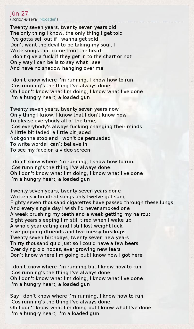 Двадцать семь лет, двадцать семь лет, Единственное, что мной усвоено, единственное, что мне втолковано: Нужно кого-то продавать, если хочешь удачных продаж, Но я не желаю отдавать душу дьяволу, я Пишу песни, идущие от сердца, И плевать, попадут ли они в верхние строчки хит-парадов. Говорю то, что вижу, иначе не умею, И тень на меня не отброшена. Я не ведаю, куда бегу, знаю только, как бежать, Ведь я занимаюсь этим всю свою жизнь. О, я не ведаю, что делаю, зато знаю, что уже сделано, Я – голодное сердце, заряженный мушкет. Двадцать семь лет, теперь мне двадцать семь лет, И мне понятно лишь, что непонятно, как Всё время всем угождать, Ведь люди чертовски быстро меняют свои вкусы. Немножко выцветший, немножко потрёпанный, Я, тем не менее, не собираюсь останавливаться, меня не убедишь Написать слова, которым я не верю, Посулив, что моё лицо покажут по ящику. Не ведаю, куда бегу, знаю только, как бежать, Ведь я занимаюсь этим всю свою жизнь. О, я не ведаю, что делаю, зато знаю, что уже сделано, Я – голодное сердце, заряженный мушкет. Двадцать семь лет, двадцать семь лет за плечами, Семь сотен песен написано и лишь двенадцать спето, Дым восьмидесяти семи тысяч сигарет пропущен через лёгкие, И каждый божий день я сожалею о том, что однажды начал курить. Неделю чищу зубы и неделю стригусь, Восемь лет сплю, но просыпаясь, по-прежнему чувствую усталость. Целый год трапез и, чёрт, всё та же потеря веса, Пять хороших девушек и пять нехороших расставаний. Двадцать семь дней рождений, двадцать семь новогодних ночей, Тридцать семь тысяч фунтов потрачены на то, чтобы глотнуть чуток пивка, Вечно умирающие старые надежды, вечно растущие новые страхи, Не знаю, куда я двигаюсь, зато знаю, как я здесь оказался. Не ведаю, куда бегу, знаю только, как бежать, Ведь я занимаюсь этим всю свою жизнь. О, я не ведаю, что делаю, зато знаю, что уже сделано, Я – голодное сердце, заряженный мушкет. Так что, я не ведаю, куда бегу, знаю только, как бежать, Ведь я занимаюсь этим всю свою жизнь. О, я не ведаю, что делаю, зато знаю, что уже сделано, Я – голодное сердце, заряженный мушкет