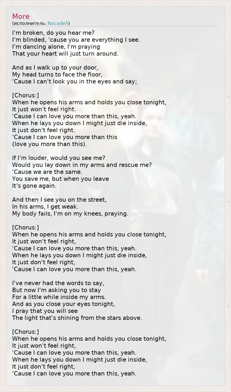 I'm broken, do you hear me? I'm blinded, 'cause you are everything I see. I'm dancing alone, I'm praying That your heart will just turn around. And as I walk up to your door, My head turns to face the floor, 'Cause I can't look you in the eyes and say; [Chorus:] When he opens his arms and holds you close tonight, It just won't feel right. 'Cause I can love you more than this, yeah. When he lays you down I might just die inside, It just don't feel right. 'Cause I can love you more than this (love you more than this). If I'm louder, would you see me? Would you lay down in my arms and rescue me? 'Cause we are the same. You save me, but when you leave It's gone again. And then I see you on the street, In his arms, I get weak. My body fails, I'm on my knees, praying. [Chorus:] When he opens his arms and holds you close tonight, It just won't feel right, 'Cause I can love you more than this, yeah. When he lays you down I might just die inside, It just don't feel right, 'Cause I can love you more than this, yeah. I've never had the words to say, But now I'm asking you to stay For a little while inside my arms. And as you close your eyes tonight, I pray that you will see The light that's shining from the stars above. [Chorus:] When he opens his arms and holds you close tonight, It just won't feel right, 'Cause I can love you more than this, yeah. When he lays you down I might just die inside, It just don't feel right, 'Cause I can love you more than this, yeah.