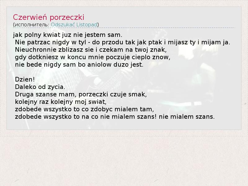 jak polny kwiat juz nie jestem sam. Nie patrzac nigdy w tyl - do przodu tak jak ptak i mijasz ty i mijam ja. Nieuchronnie zblizasz sie i czekam na twoj znak, gdy dotkniesz w koncu mnie poczuje cieplo znow, nie bede nigdy sam bo aniolow duzo jest. Dzien! Daleko od zycia. Druga szanse mam, porzeczki czuje smak, kolejny raz kolejny moj swiat, zdobede wszystko to co zdobyc mialem tam, zdobede wszystko to na co nie mialem szans! nie mialem szans.