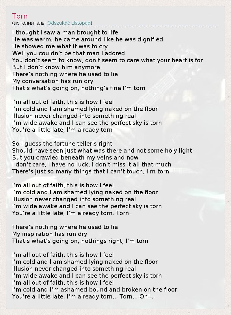 I thought I saw a man brought to life He was warm, he came around like he was dignified He showed me what it was to cry Well you couldn't be that man I adored You don't seem to know, don't seem to care what your heart is for But I don't know him anymore There's nothing where he used to lie My conversation has run dry That's what's going on, nothing's fine I'm torn I'm all out of faith, this is how I feel I'm cold and I am shamed lying naked on the floor Illusion never changed into something real I'm wide awake and I can see the perfect sky is torn You're a little late, I'm already torn So I guess the fortune teller's right Should have seen just what was there and not some holy light But you crawled beneath my veins and now I don't care, I have no luck, I don't miss it all that much There's just so many things that I can't touch, I'm torn I'm all out of faith, this is how I feel I'm cold and I am shamed lying naked on the floor Illusion never changed into something real I'm wide awake and I can see the perfect sky is torn You're a little late, I'm already torn. Torn. There's nothing where he used to lie My inspiration has run dry That's what's going on, nothings right, I'm torn I'm all out of faith, this is how I feel I'm cold and I am shamed lying naked on the floor Illusion never changed into something real I'm wide awake and I can see the perfect sky is torn I'm all out of faith, this is how I feel I'm cold and I'm ashamed bound and broken on the floor You're a little late, I'm already torn... Torn... Oh!..