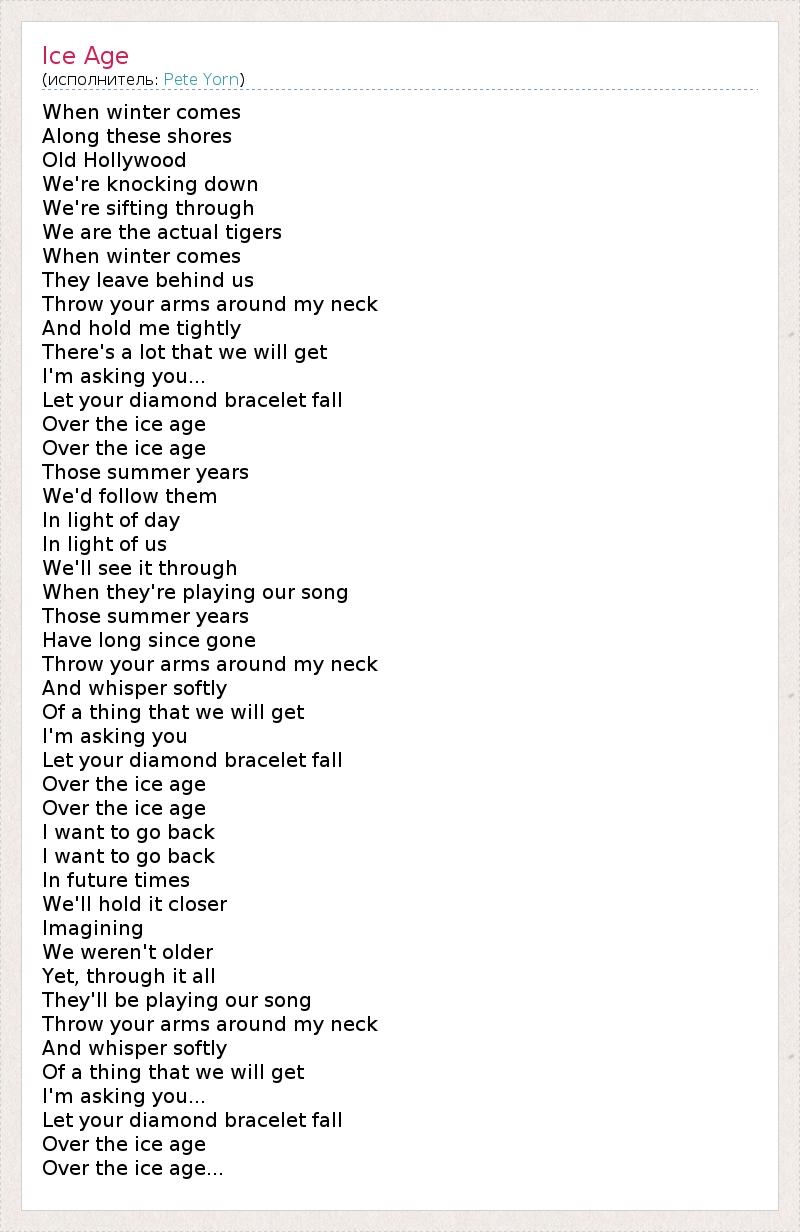 When winter comes Along these shores Old Hollywood We're knocking down We're sifting through We are the actual tigers When winter comes They leave behind us Throw your arms around my neck And hold me tightly There's a lot that we will get I'm asking you... Let your diamond bracelet fall Over the ice age Over the ice age Those summer years We'd follow them In light of day In light of us We'll see it through When they're playing our song Those summer years Have long since gone Throw your arms around my neck And whisper softly Of a thing that we will get I'm asking you Let your diamond bracelet fall Over the ice age Over the ice age I want to go back I want to go back In future times We'll hold it closer Imagining We weren't older Yet, through it all They'll be playing our song Throw your arms around my neck And whisper softly Of a thing that we will get I'm asking you... Let your diamond bracelet fall Over the ice age Over the ice age...