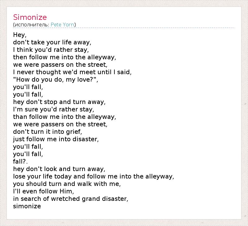Hey, don't take your life away, I think you'd rather stay, then follow me into the alleyway, we were passers on the street, I never thought we'd meet until I said, "How do you do, my love?", you'll fall, you'll fall, hey don't stop and turn away, I'm sure you'd rather stay, than follow me into the alleyway, we were passers on the street, don't turn it into grief, just follow me into disaster, you'll fall, you'll fall, fall?. hey don't look and turn away, lose your life today and follow me into the alleyway, you should turn and walk with me, I'll even follow Him, in search of wretched grand disaster, simonize