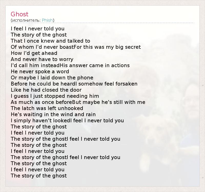 I feel I never told you The story of the ghost That I once knew and talked to Of whom I'd never boastFor this was my big secret How I'd get ahead And never have to worry I'd call him insteadHis answer came in actions He never spoke a word Or maybe I laid down the phone Before he could be heardI somehow feel forsaken Like he had closed the door I guess I just stopped needing him As much as once beforeBut maybe he's still with me The latch was left unhooked He's waiting in the wind and rain I simply haven't lookedI feel I never told you The story of the ghost I feel I never told you The story of the ghostI feel I never told you The story of the ghost I feel I never told you The story of the ghostI feel I never told you The story of the ghost I feel I never told you The story of the ghost