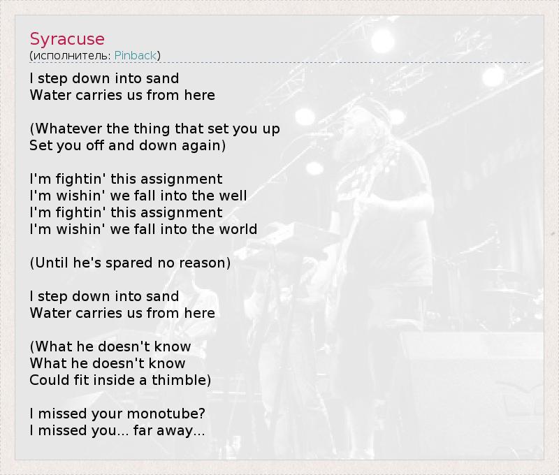 I step down into sand Water carries us from here (Whatever the thing that set you up Set you off and down again) I'm fightin' this assignment I'm wishin' we fall into the well I'm fightin' this assignment I'm wishin' we fall into the world (Until he's spared no reason) I step down into sand Water carries us from here (What he doesn't know What he doesn't know Could fit inside a thimble) I missed your monotube? I missed you... far away...