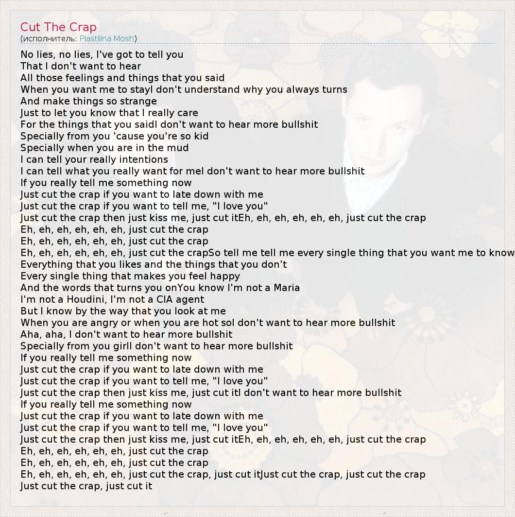 No lies, no lies, I've got to tell you That I don't want to hear All those feelings and things that you said When you want me to stayI don't understand why you always turns And make things so strange Just to let you know that I really care For the things that you saidI don't want to hear more bullshit Specially from you 'cause you're so kid Specially when you are in the mud I can tell your really intentions I can tell what you really want for meI don't want to hear more bullshit If you really tell me something now Just cut the crap if you want to late down with me Just cut the crap if you want to tell me, "I love you" Just cut the crap then just kiss me, just cut itEh, eh, eh, eh, eh, eh, just cut the crap Eh, eh, eh, eh, eh, eh, just cut the crap Eh, eh, eh, eh, eh, eh, just cut the crap Eh, eh, eh, eh, eh, eh, just cut the crapSo tell me tell me every single thing that you want me to know Everything that you likes and the things that you don't Every single thing that makes you feel happy And the words that turns you onYou know I'm not a Maria I'm not a Houdini, I'm not a CIA agent But I know by the way that you look at me When you are angry or when you are hot soI don't want to hear more bullshit Aha, aha, I don't want to hear more bullshit Specially from you girlI don't want to hear more bullshit If you really tell me something now Just cut the crap if you want to late down with me Just cut the crap if you want to tell me, "I love you" Just cut the crap then just kiss me, just cut itI don't want to hear more bullshit If you really tell me something now Just cut the crap if you want to late down with me Just cut the crap if you want to tell me, "I love you" Just cut the crap then just kiss me, just cut itEh, eh, eh, eh, eh, eh, just cut the crap Eh, eh, eh, eh, eh, eh, just cut the crap Eh, eh, eh, eh, eh, eh, just cut the crap Eh, eh, eh, eh, eh, eh, just cut the crap, just cut itJust cut the crap, just cut the crap Just cut the crap, just cut it