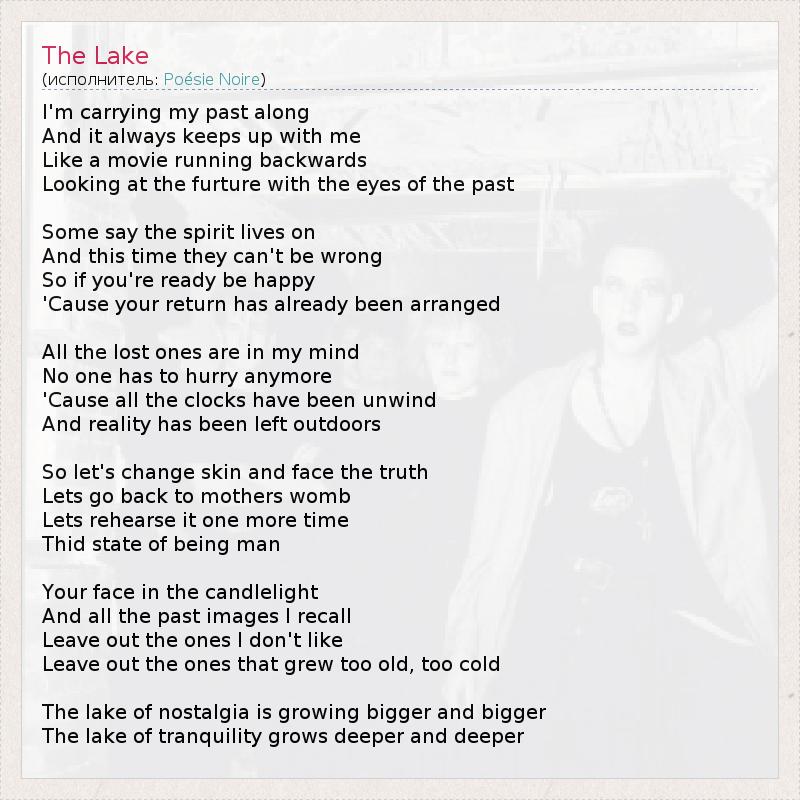 Я несу свое прошлое вместе И он всегда идет в ногу со мной Какфильм побежала назад Глядя на furture с глазами прошлого Некоторые говорят, чтодух живет И на этот раз они не могут ошибаться Так что, если вы готовы быть счастливым Потому что ваше возвращение уже были организованы Все потерянные из них , на мой взгляд Никто не должен спешить больше Потому что все часы были расслабиться И реальность была оставлена на открытом воздухе Так давайте изменим кожу и смотреть правде в глаза Давайте вернемся к утробе матери Давайте репетировать ее еще раз, Thid состояние бытия человека Ваше лицо в свечах И все последние изображения я помню Оставить только те, которые мне не нравятся Оставить только те, которые росли слишком стар , слишком холодно Озеро ностальгии растет все больше и больше Озеро спокойствия растет все глубже и глубже