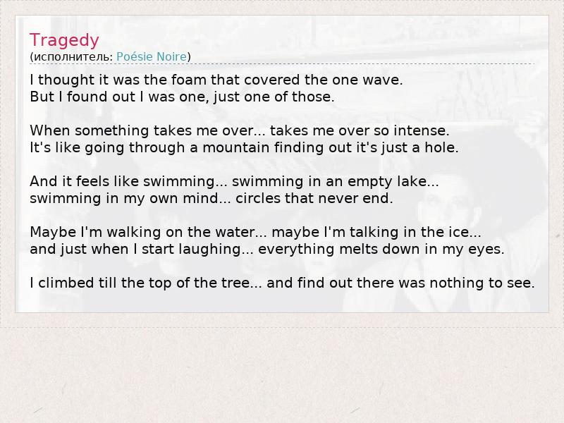 Я думал, что это былопены , которая покрывает одну волну . Но я узнал, что я был один, только один из них. Когда что-то берет меня за ... берет меня за так интенсивно. Это как переживает горе выяснить это простодыра. И он чувствует, как плавание ... купание в пустом озере ... купание в моей голове ... кругах, которые никогда не заканчиваются . Может быть, я иду на воде ... Может быть, я говорю во льду ... и только когда я начинаю смеяться ... все тает в моих глазах. Я поднялся до вершины дерева ... и выяснить, не было ничего, чтобы видеть .