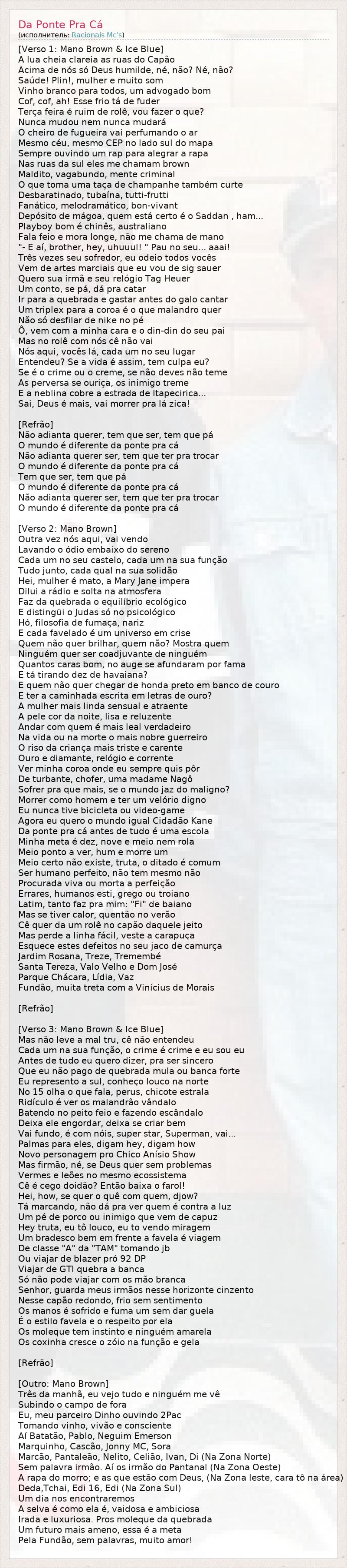 Это интересно:Участники группы Mano Brown, Edi Rock, Ice Blue & DJ KL Jay - выходцы из фавел, располагающихся на окраинах Сан-Паулу, начали выступать в 1980-х годах.В 1988 году была сделана первая запись, вошедшая в сборник "Consciência Black".В 1990 году вышел их первый альбом "Holocausto Urbano".Альбом "Sobrevivendo no Inferno", выпущенный в 1997 году, принес группе достаточно широкую известность (тираж более 500 000 дисков).Тем... продолжение