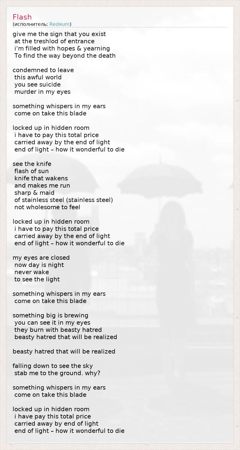 give me the sign that you exist at the treshlod of entrance i'm filled with hopes & yearning To find the way beyond the death condemned to leave this awful world you see suicide murder in my eyes something whispers in my ears come on take this blade locked up in hidden room i have to pay this total price carried away by the end of light end of light – how it wonderful to die see the knife flash of sun knife that wakens and makes me run sharp & maid of stainless steel (stainless steel) not wholesome to feel locked up in hidden room i have to pay this total price carried away by the end of light end of light – how it wonderful to die my eyes are closed now day is night never wake to see the light something whispers in my ears come on take this blade something big is brewing you can see it in my eyes they burn with beasty hatred beasty hatred that will be realized beasty hatred that will be realized falling down to see the sky stab me to the ground. why? something whispers in my ears come on take this blade locked up in hidden room i have pay this total price carried away by end of light end of light – how it wonderful to die