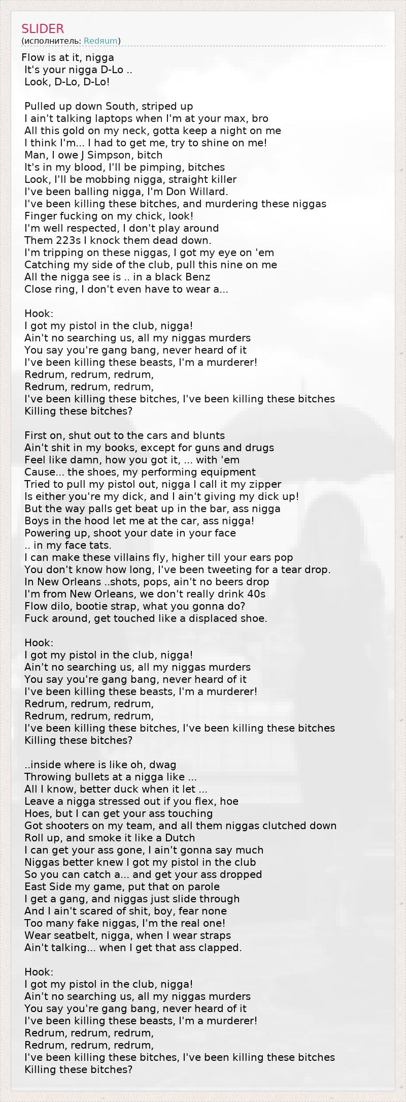 Flow is at it, nigga It's your nigga D-Lo .. Look, D-Lo, D-Lo! Pulled up down South, striped up I ain't talking laptops when I'm at your max, bro All this gold on my neck, gotta keep a night on me I think I'm... I had to get me, try to shine on me! Man, I owe J Simpson, bitch It's in my blood, I'll be pimping, bitches Look, I'll be mobbing nigga, straight killer I've been balling nigga, I'm Don Willard. I've been killing these bitches, and murdering these niggas Finger fucking on my chick, look! I'm well respected, I don't play around Them 223s I knock them dead down. I'm tripping on these niggas, I got my eye on 'em Catching my side of the club, pull this nine on me All the nigga see is .. in a black Benz Close ring, I don't even have to wear a... Hook: I got my pistol in the club, nigga! Ain't no searching us, all my niggas murders You say you're gang bang, never heard of it I've been killing these beasts, I'm a murderer! Redrum, redrum, redrum, Redrum, redrum, redrum, I've been killing these bitches, I've been killing these bitches Killing these bitches? First on, shut out to the cars and blunts Ain't shit in my books, except for guns and drugs Feel like damn, how you got it, ... with 'em Cause... the shoes, my performing equipment Tried to pull my pistol out, nigga I call it my zipper Is either you're my dick, and I ain't giving my dick up! But the way palls get beat up in the bar, ass nigga Boys in the hood let me at the car, ass nigga! Powering up, shoot your date in your face .. in my face tats. I can make these villains fly, higher till your ears pop You don't know how long, I've been tweeting for a tear drop. In New Orleans ..shots, pops, ain't no beers drop I'm from New Orleans, we don't really drink 40s Flow dilo, bootie strap, what you gonna do? Fuck around, get touched like a displaced shoe. Hook: I got my pistol in the club, nigga! Ain't no searching us, all my niggas murders You say you're gang bang, never heard of it I've been killing these beasts, I'm a murderer! Redrum, redrum, redrum, Redrum, redrum, redrum, I've been killing these bitches, I've been killing these bitches Killing these bitches? ..inside where is like oh, dwag Throwing bullets at a nigga like ... All I know, better duck when it let ... Leave a nigga stressed out if you flex, hoe Hoes, but I can get your ass touching Got shooters on my team, and all them niggas clutched down Roll up, and smoke it like a Dutch I can get your ass gone, I ain't gonna say much Niggas better knew I got my pistol in the club So you can catch a... and get your ass dropped East Side my game, put that on parole I get a gang, and niggas just slide through And I ain't scared of shit, boy, fear none Too many fake niggas, I'm the real one! Wear seatbelt, nigga, when I wear straps Ain't talking... when I get that ass clapped. Hook: I got my pistol in the club, nigga! Ain't no searching us, all my niggas murders You say you're gang bang, never heard of it I've been killing these beasts, I'm a murderer! Redrum, redrum, redrum, Redrum, redrum, redrum, I've been killing these bitches, I've been killing these bitches Killing these bitches?