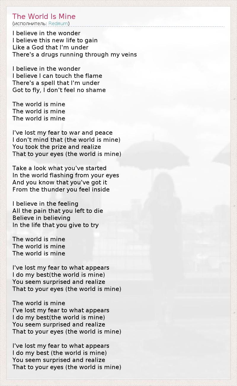Я верю в чудо. Я верю в то, что смогу больше получить от этой новой жизни. Как Бог, который надо мной, По моим венам разносится опьяняющее зелье. Я верю в чудо. Я верю в то, что могу дотронуться до пламени. Я – зачарованный. Я должен лететь, и мне не стыдно. Мир принадлежит мне. Мир принадлежит мне. Мир принадлежит мне. Во мне больше нет страха, что миру придёт конец и будет война. Я не против этого (мир принадлежит мне). Ты выиграла и понимаешь, Что в твоих глазах (мир принадлежит мне). Посмотри, что ты начала В мире, отражающемся в твоих глазах. Ты понимаешь, что достигла цели По клокочущему чувству в груди. Я верю в чувство, В боль, которую ты оставила, чтобы умереть. Я верю в веру В жизнь, которую ты отдаёшь, чтобы попытаться. Мир принадлежит мне. Мир принадлежит мне. Мир принадлежит мне. Я не испытываю страха к тому, что кажется. Я стараюсь (мир принадлежит мне). Ты кажешься удивлённой и понимаешь, Что в твоих глазах (мир принадлежит мне). Мир принадлежит мне. Я не испытываю страха к тому, что кажется. Я стараюсь (мир принадлежит мне). Ты кажешься удивлённой и понимаешь, Что в твоих глазах (мир принадлежит мне). Я не испытываю страха к тому, что кажется. Я стараюсь (мир принадлежит мне). Ты кажешься удивлённой и понимаешь, Что в твоих глазах (мир принадлежит мне).