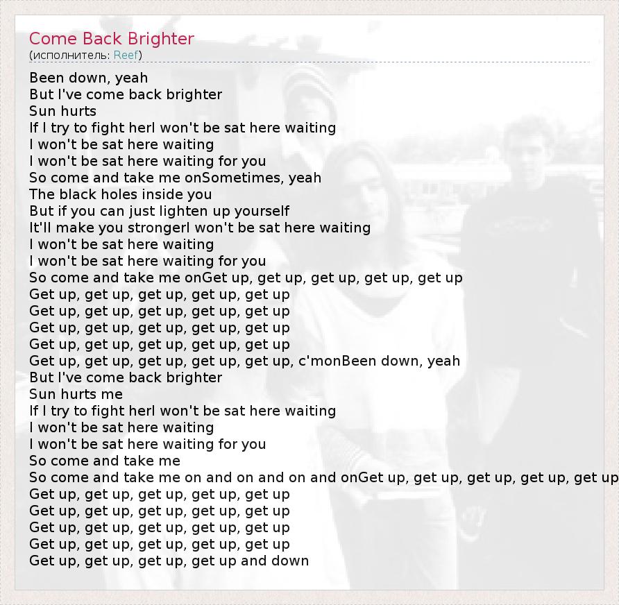 Been down, yeah But I've come back brighter Sun hurts If I try to fight herI won't be sat here waiting I won't be sat here waiting I won't be sat here waiting for you So come and take me onSometimes, yeah The black holes inside you But if you can just lighten up yourself It'll make you strongerI won't be sat here waiting I won't be sat here waiting I won't be sat here waiting for you So come and take me onGet up, get up, get up, get up, get up Get up, get up, get up, get up, get up Get up, get up, get up, get up, get up Get up, get up, get up, get up, get up Get up, get up, get up, get up, get up Get up, get up, get up, get up, get up, c'monBeen down, yeah But I've come back brighter Sun hurts me If I try to fight herI won't be sat here waiting I won't be sat here waiting I won't be sat here waiting for you So come and take me So come and take me on and on and on and onGet up, get up, get up, get up, get up Get up, get up, get up, get up, get up Get up, get up, get up, get up, get up Get up, get up, get up, get up, get up Get up, get up, get up, get up, get up Get up, get up, get up, get up and down