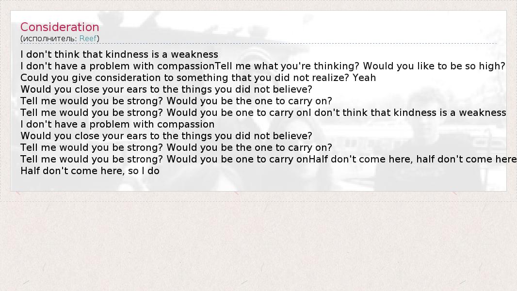 А как ты думаешь, о чем песня "Consideration" ?